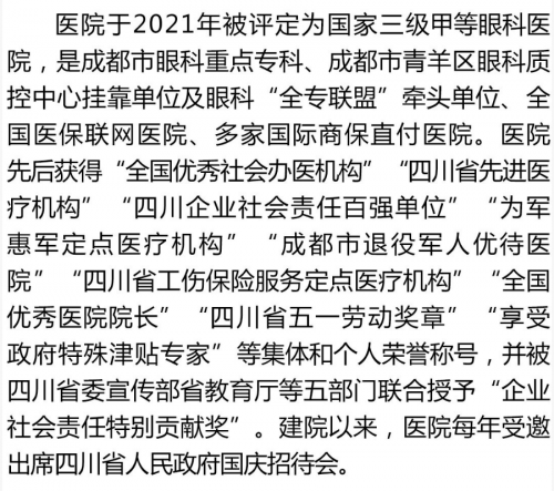 屈光学科由华西医院眼科著名专家、华西医院激光及晶体植入矫正近视技术开拓者王琳教授,德国蔡司全飞秒激光技术培训导师、中国(成渝)名医榜名医杨雨昆主任领衔主导。科室巨资引进全国首批德国蔡司全新一代机器人全飞秒VISUMAX 800系统及微创全飞秒系统(精准4.0-VISULYZE/SMILE 3.0)、德国阿玛仕准分子激光系统、德国PENTACAM三维眼前节分析诊断系统、英国欧堡免散瞳广角激光扫描镜等确保屈光矫正手术精准、快速、安全开展医院制定了近视手术26项术前全面检查标准严格执行14项三甲手术质控标准,创新启动近视手术眼科全科联合会诊制度,打造全流程一体化质控体系。自与德国蔡司、瑞士STARR合作以来医院因手术质量、数量双双位居全国前列,先后荣膺全国首批德国蔡司新一代机器人全飞秒VISUMAX 800及新微创手术SMILE pro临床合作单位,Smile手术质量杰出贡献奖,德国蔡司微创全飞秒精准4.0-VISULYZE、全国患教培训及科普示范基地,瑞士EVO-ICLspecialist国际认证项目(中国区)患教培训基地等称号。