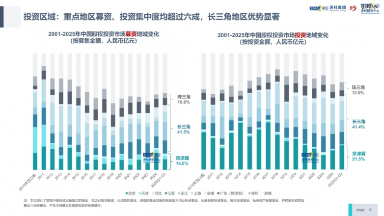 区域的变化也值得关注。募资上,京津冀地区前三季度的募资金额占全国总募资额的14%,珠三角是10.6%,而长三角达到了41.5%——几乎是京津冀加上珠三角之和的两倍。投资上,京津冀地区连续三年回升,今年该地区发生的投资金额占比21.5%,珠三角是12%,长三角为41.4%,以及湖南的投资特别活跃。