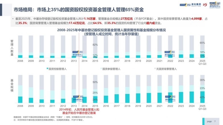按照截至2025年中基协存续登记股权投资基金管理人数量与基金总规模计算,国资背景管理人数量占比35.3%,其所管理的基金规模占比64.5%。换言之,35%的国资机构管理了行业内超六成的钱,这个变化是比较大的。