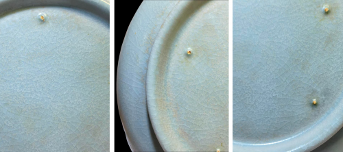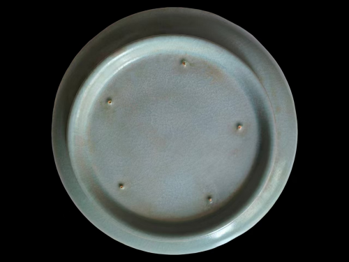 汝窑工艺的核心密码,藏在器物底部的细微之处。这件葵口盘采用汝窑标志性的 “满釉裹足支烧” 工艺,底部均匀分布着五枚细小的支钉痕,形如芝麻,故又称 “芝麻钉”。这些支钉是工匠为避免器物底足与窑具粘连,用耐火土捏制的小支钉支撑器身,烧成后敲去支钉留下的痕迹。